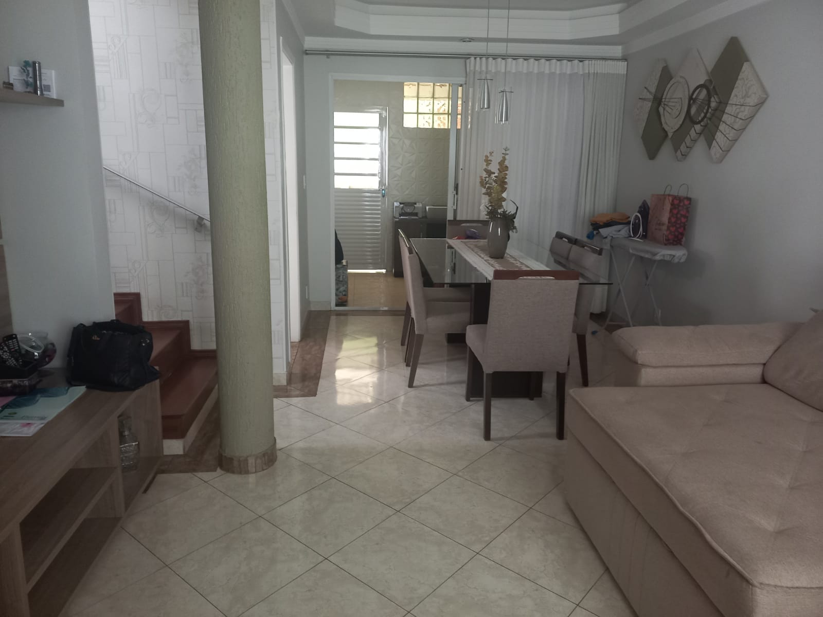 Piso inferior: Sala para dois ambientes, lavabo, cozinha com armários planejados, equipada com forno elétrico, Cook top e coifa, área gourmet, área de serviço, quintal e 2 vagas de garagem descobertas.